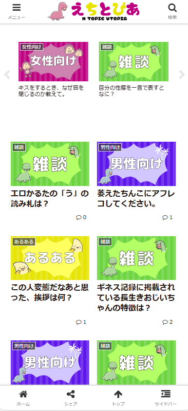 男性向け、女性向け、あるある、雑談と項目があるので、思いついたネタを投稿してね
